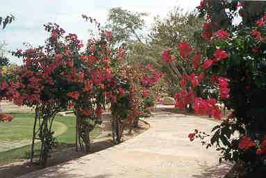 Above is a walkway lined with flowers and right are new friends, Lee and Suzanne. |
