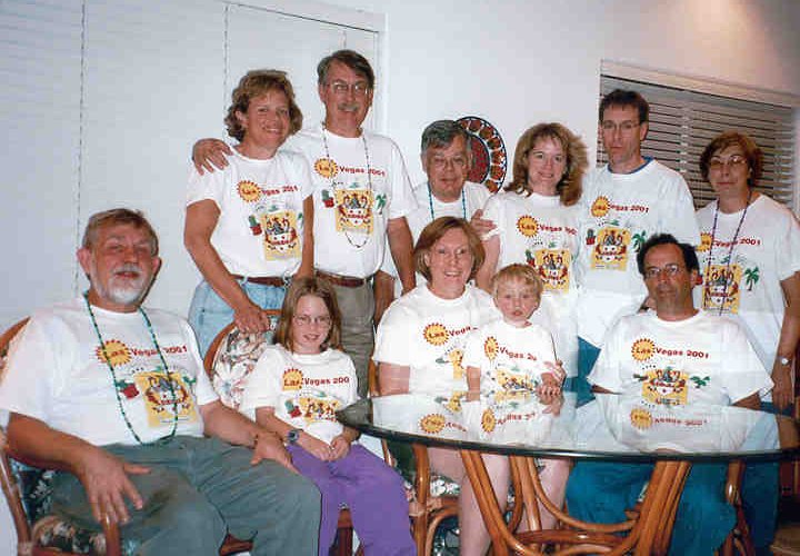 Marilyn's family got together for a Hooper Reunion. Thanksgiving 2001 Fred Peters, Sally and Loren Hooper, David Hooper, Jackie and Jeff Zank, Linda Peters. Lower: Hadley Hooper, Marilyn with Matthew, Dave Weil. We are wearing our official 2001 reunion T-shirts, featuring a Hooper Crest, and LasVegas icons, including the sun. |